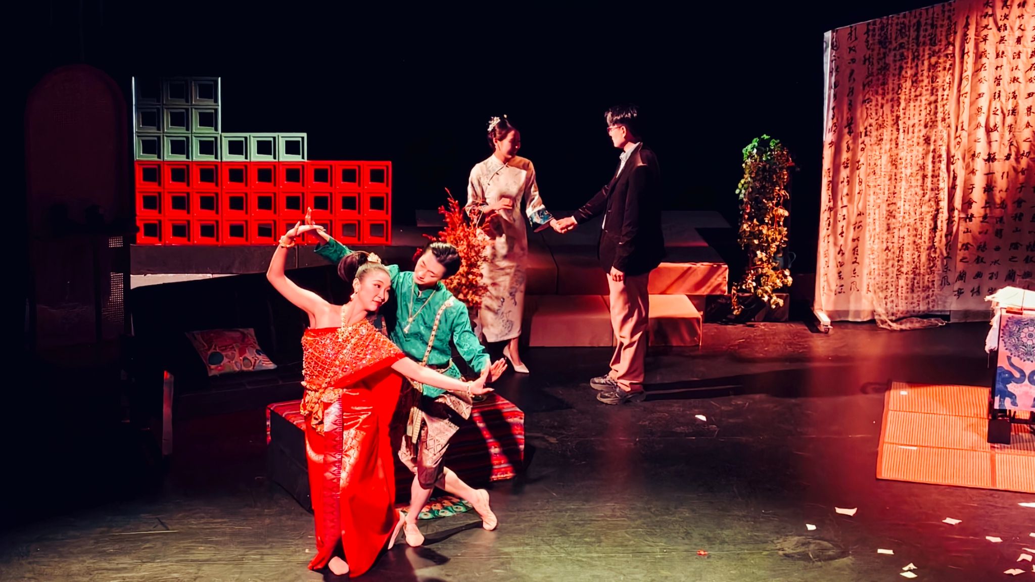 作为工作坊的开篇之作,由青年教师李凯编剧导演的《暖居》,是一次融合中泰戏剧美学的创作尝试,为两国艺术传统的对话提供了新视角。作品巧妙融合中国舞台剧的写实叙事与泰国传统舞蹈的写意韵律,生活化的台词与泰式肢体表达相互交织,将现代婚姻的沟通困境娓娓道来。剧中融合中泰元素的音乐、舞蹈以及布景,既凸显了文化差异的独特韵味,更传递出人类共通的情感共鸣,让“爱需坦诚”的内核在跨文化表达中愈发真挚动人,成为戏剧学院深耕中泰艺术交流的生动缩影。