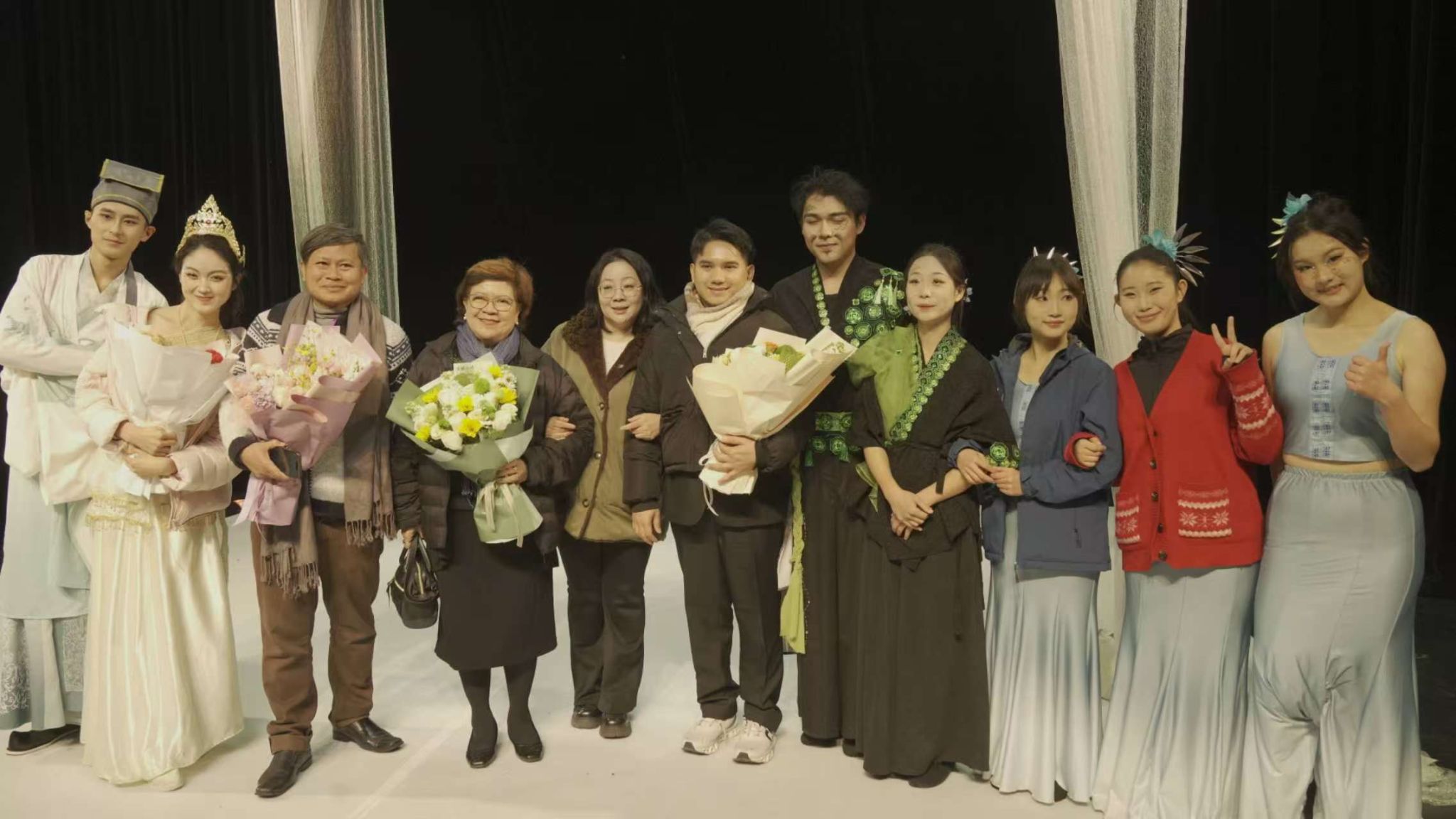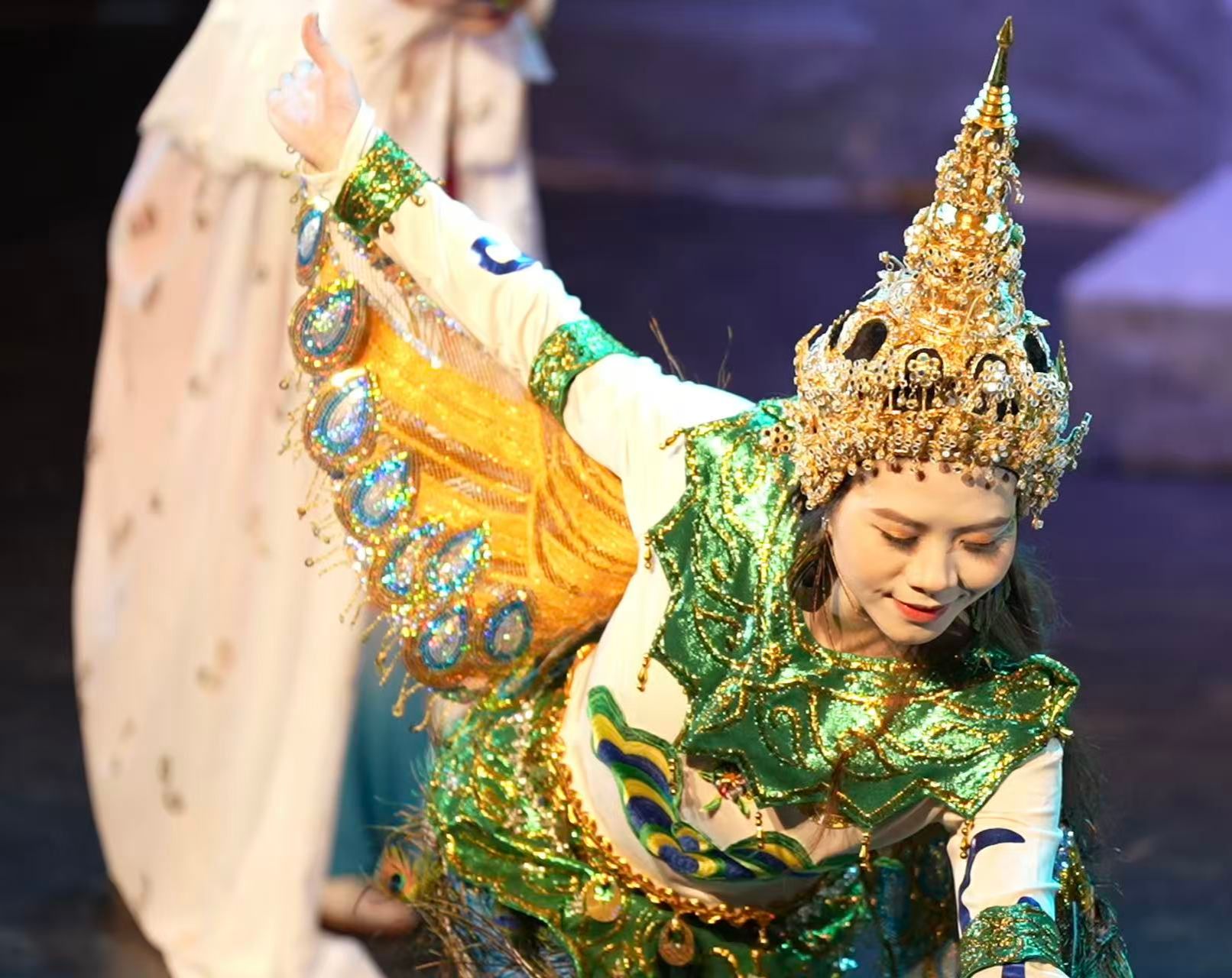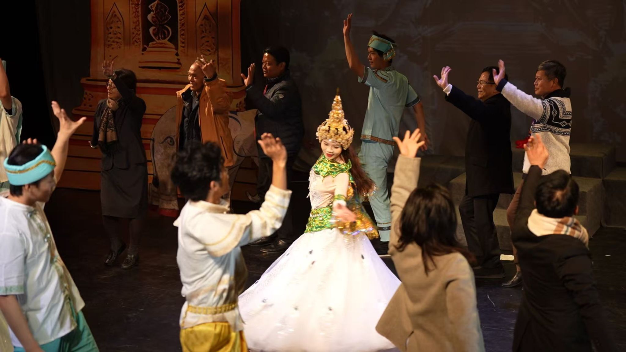 收官之作《孔雀公主》由青年教师姚又僮编剧,青年教师王菲导演,以傣泰贝叶经医药智慧为纽带,将中泰文化共生的主题推向高潮。泰国孔雀舞的灵动与中国傣族舞蹈的柔美无缝衔接,贝叶经的文化内涵既是剧情核心,更是两国艺术渊源的见证。剧中玛诺拉公主的守护之旅,不仅诠释了傣泰民众的深厚情谊,更彰显了戏剧学院以戏剧为媒,联结南亚东南亚各国文化的初心。当结尾的欢乐舞蹈响起,中泰演员、各国专家、观众朋友携手共舞,成为区域艺术交流的温暖写照。