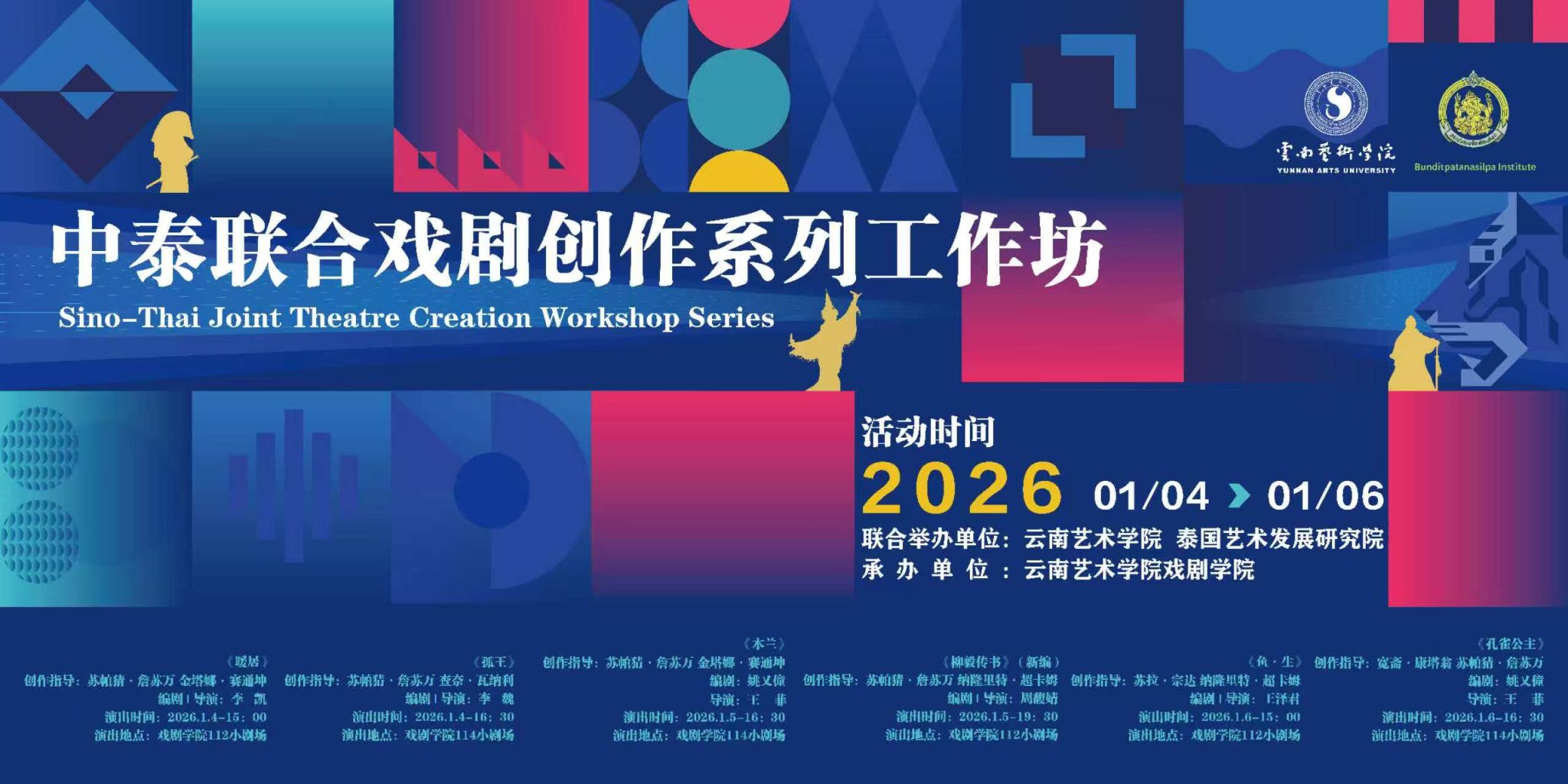 2026年1月4日至6日,由云南艺术学院主办,戏剧学院承办的中泰联合戏剧创作系列工作坊盛大启幕,10位泰国专家与学院师生齐聚一堂,以6部中泰融合剧目为载体,奏响跨文化交流的华彩乐章,为南亚东南亚艺术教育联盟的成立预热添彩。