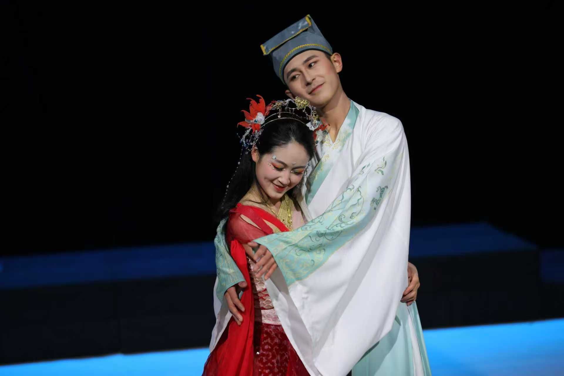青年教师周馥婧编剧导演的《柳毅传书》(新编),以女性互助为核心重构经典,成为中泰文化平等对话的舞台范本。剧中泰国娜拉公主的形象借鉴了泰国传统戏剧中侠女的果敢特质,服饰纹样取自泰式传统织锦,舞步融合孔剧的典雅与中国戏曲的灵动。她与洞庭龙女的并肩救援,打破了传统叙事的男性主导模式,更让中泰戏剧的表演精髓在侠义精神的主题下交汇共生,为传统故事注入当代价值与国际视野。