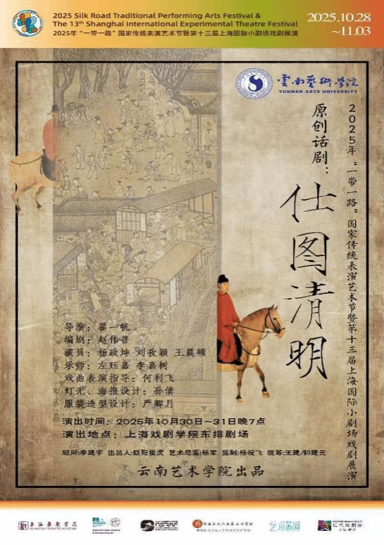 金秋沪上,艺韵流淌,盛典启幕。2025年10月28日至11月3日,由上海戏剧学院与国际表演艺术高等院校联盟联合主办的“2025‘一带一路’国家传统表演艺术节暨第十三届上海国际小剧场戏剧展演”顺利举行。云南艺术学院原创话剧《仕图清明》于10月30日、31日晚在上海戏剧学院东排剧场精彩上演,座无虚席、掌声雷动,圆满完成展演任务,赢得中外艺术家与观众的高度赞誉。