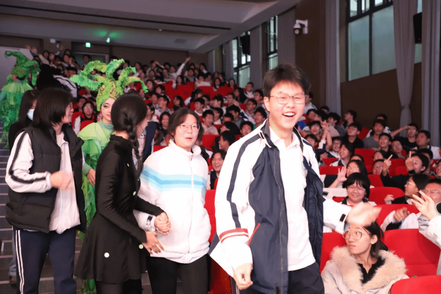 演出现场气氛热烈,高潮迭起。演员们凭借精湛的演技,将剧中角色塑造得淋漓尽致,无论是塔黄在风雪中顽强生长的坚韧身姿、狂风席卷山林的磅礴气势,还是雪兔子机敏灵动的活泼姿态与红景天在岩缝中顽强求生的执着精神,都以极具感染力的舞台表现牢牢抓住了全场师生的目光。当演员们走下舞台与观众互动时,在场高中生展现出超乎预期的热情,他们纷纷起身,欢呼雀跃,争先恐后地与演员们击掌、互动,用最热烈的掌声和欢呼表达他们对剧目的喜爱。这种沉浸式的艺术体验,让整场演出成为了一次有效的艺术疗愈,帮助高中学子们暂时卸下学业的压力,在艺术的海洋中获得心灵的释放与情感的宣泄。