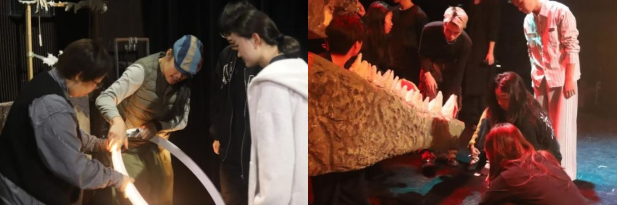 10月13日起,剧组进入集中排练阶段。在大卫·格拉斯导演、澳门木偶艺术家林婷婷、视觉艺术家赵七、AI音乐艺术家袁野博士及舞台美术、服装设计等多位教师的共同指导下,学生们逐步将偶剧表演、肢体剧场、动画投影与人工智能生成的音乐与影像融为一体,构建出一个既真实又充满想象力的戏剧世界。
